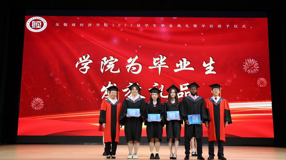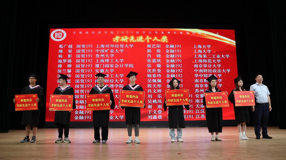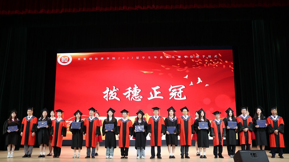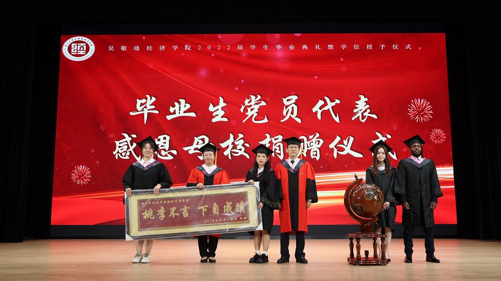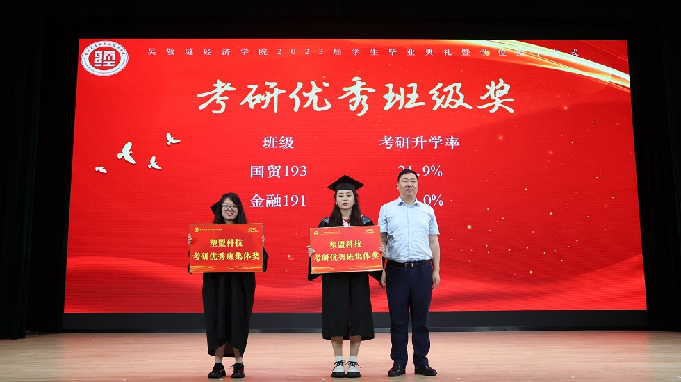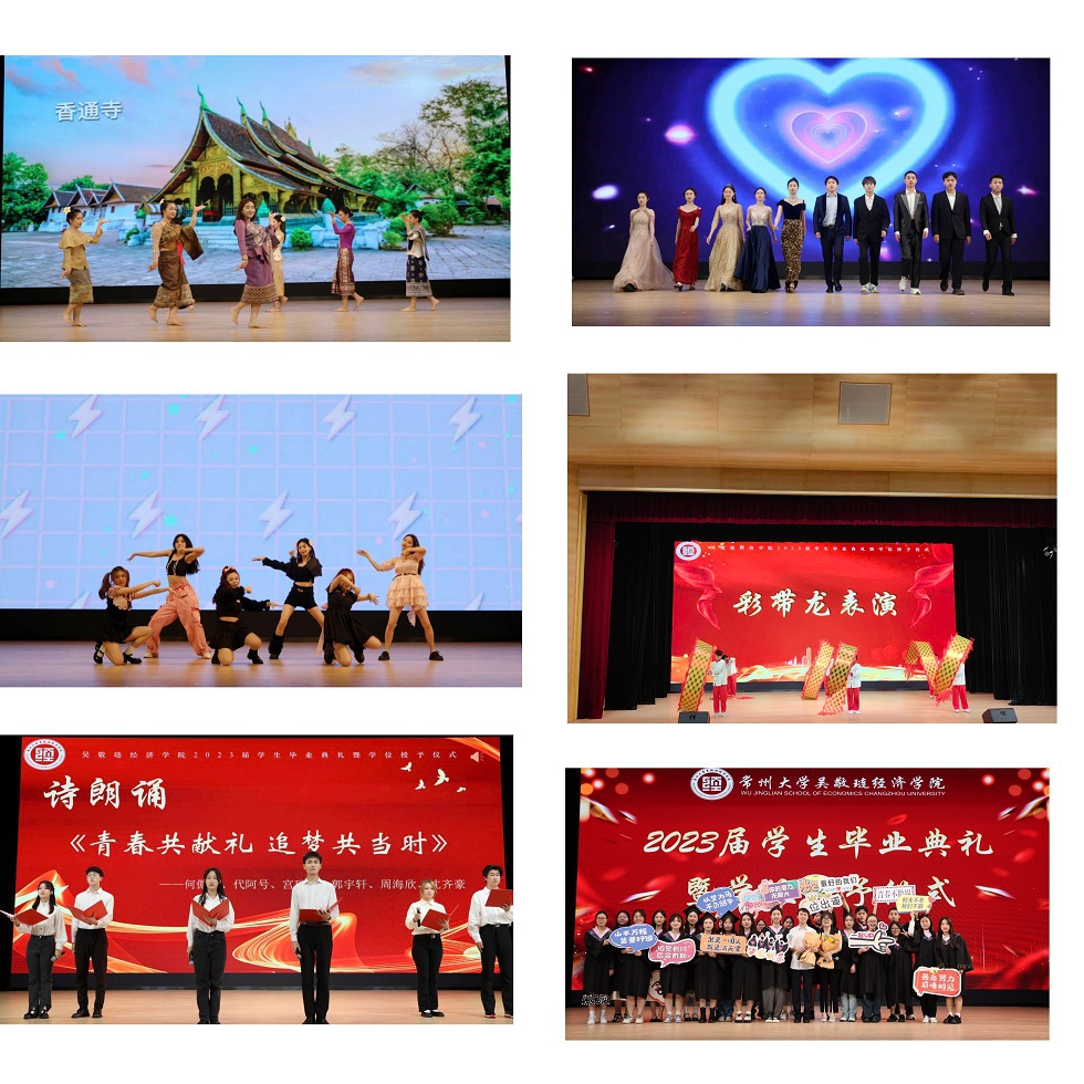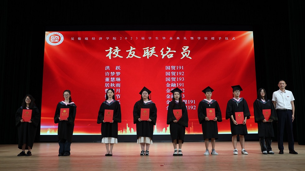 接下来,龚东卫为考研先进个人、考研优秀班集体颁发表彰。院长助理、金融系主任曹启龙宣读校优秀毕业生表彰决定。随着动感舞蹈的律动,朗朗诵读的萦绕,2023届毕业生学位授予仪式开始,由姜鸿、季小立等十位老师为2023届毕业生拨穗正冠。随后,金融191张晓旭和国贸194  VIRIRI  REGINALD TINOTENDA作为优秀毕业生代表发言,他们感恩母校与老师的悉心培育,勉励全体毕业生坚定信念、追逐梦想,不负青春年华。紧接着,毕业生捐赠仪式及咪咕体育直播 毕业礼品发放仪式开始,感恩母校情、莘莘学子心在这一刻彰显。邓伟为毕业生颁发校友联络员聘书,希望校友联络人架起母校与毕业生间坚固的桥梁。龙腾虎跃,舞姿铿锵,留学生舞龙队带来的表演振奋全场。最后,典礼在一首《凤凰花开的路口》中落下帷幕,圆满收官。