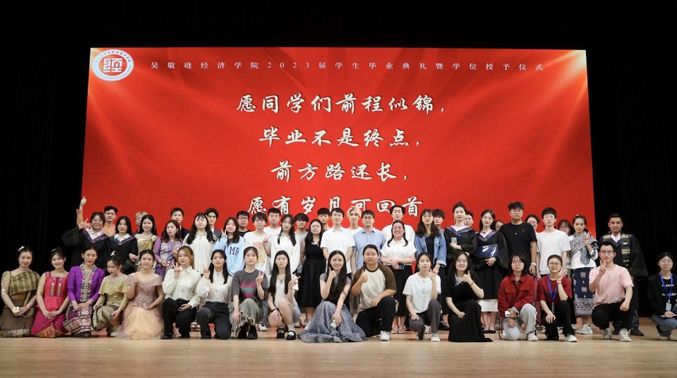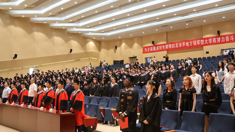 热场环节上,循环播放的师生祝福视频、老挝留学生带来的传统民族舞及2023届毕业生代表的精彩走秀点燃了现场气氛。在庄严的国歌声中,典礼正式拉开帷幕。姜鸿做毕业典礼致辞,他向毕业生提出了“有情”和“有为”两大要求,“有情”即懂得感恩、珍惜情谊,拥有健康的心灵,积极乐观地看待问题;“有为”意味着要努力工作,活到老学到老,虚心向他人学习,勇于接受他人的批评,最后姜书记亦表达了对毕业生们的殷切期望和衷心祝愿。