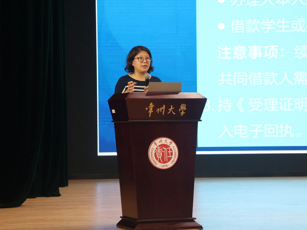 苏扬婧老师从资助体系、工作目标、总体思路、基本原则、管理机构、困难认定、申贷流程等方面详细地介绍了奖助补贷政策,并对常州市大学生城镇居民医保政策进行了完整解读。她表示,奖助补贷政策一方面旨在从物质层面切实帮助家庭经济困难的同学完成学业,另一方面更致力于从精神层面激励同学们自强不息、力争上游,希望同学们以相关政策为引导,努力学习、服务社会,争做有责任、有担当的青年大学生。