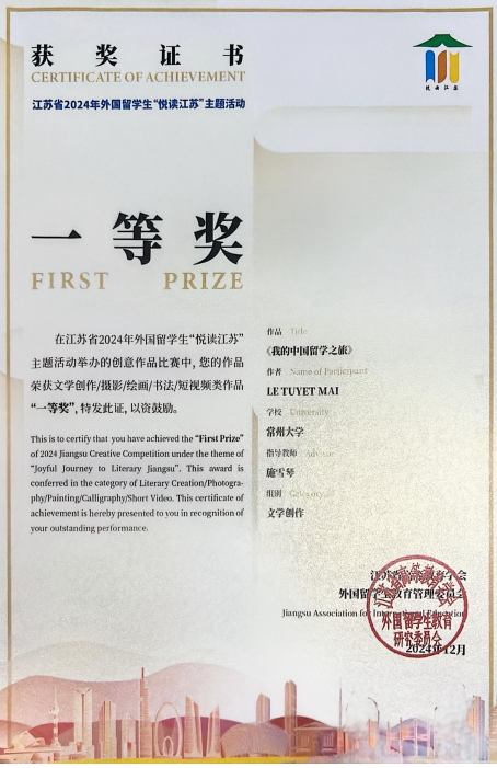 咪咕体育直播 国际商务专业留学生LE TUYET MAI 的作品《我的中国留学之旅》脱颖而出,荣获江苏省文字创作类一等奖。该作品以细腻的笔触、真挚的情感,生动地展现了她在中国留学期间的所见、所闻、所感以及对中国文化的深刻理解和热爱。