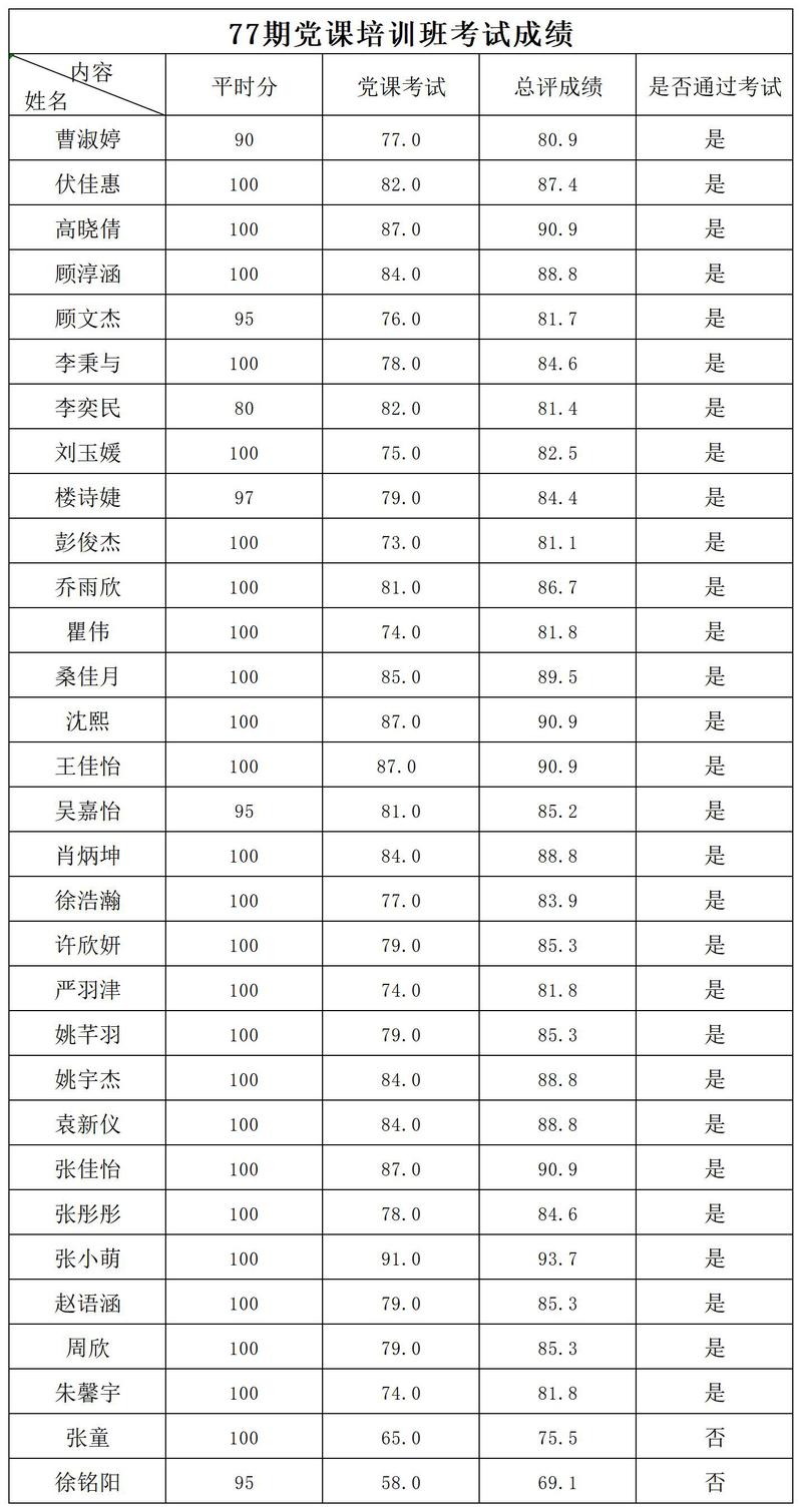 为贯彻落实习近平新时代中国特色社会主义思想,深入学习党章党规知识及党的有关文件内涵,咪咕体育直播 开展了第77期党章党规培训与考试。现将考核结果公示,名单如下: