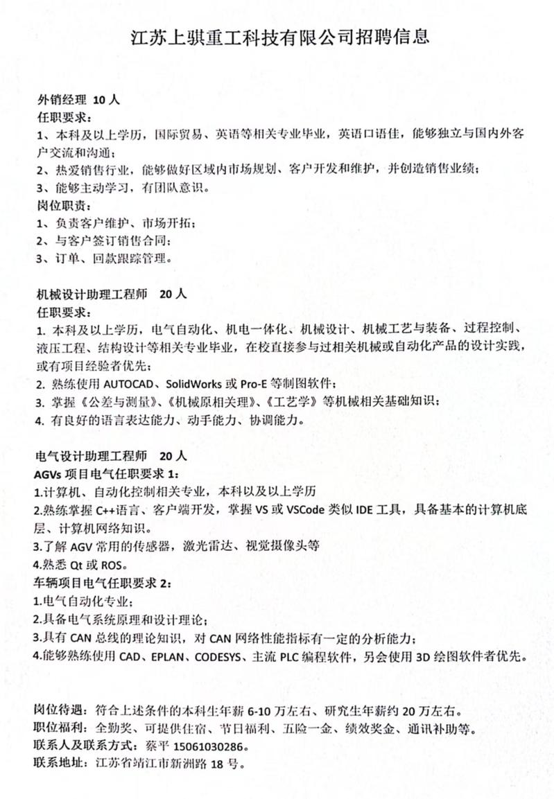 江苏上骐重工科技有限公司招聘简章