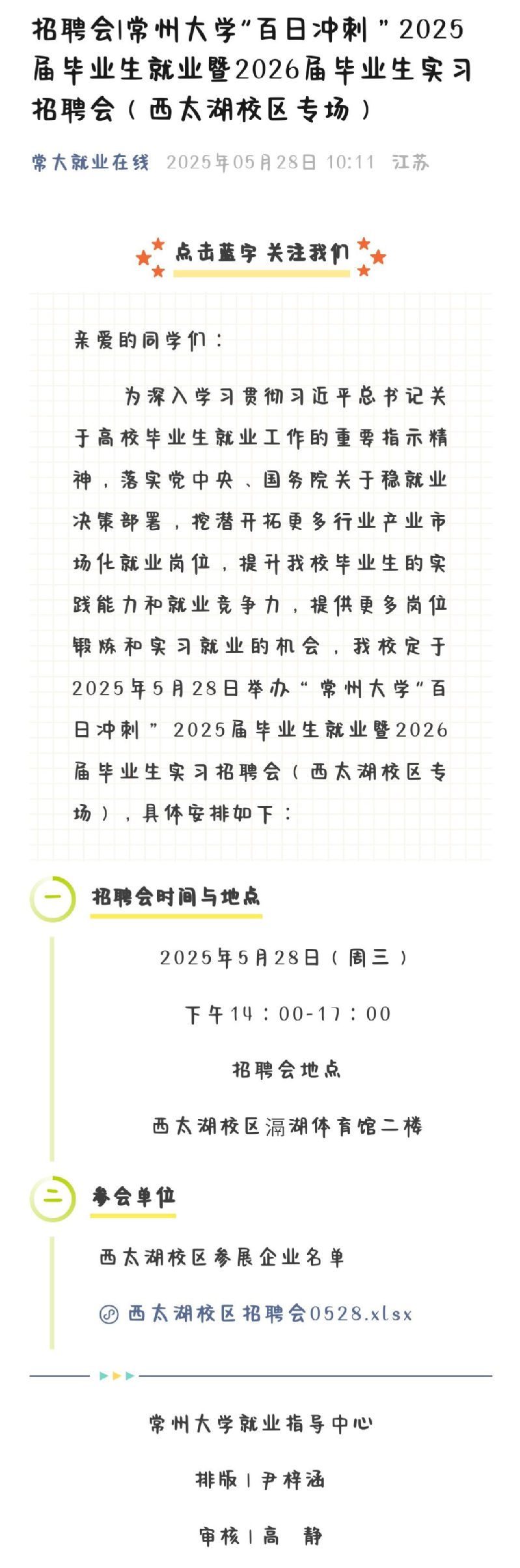 招聘会|常州大学"百日冲刺”2025届毕业生就业暨2026届毕业生实习招聘会(西太湖校区专场)