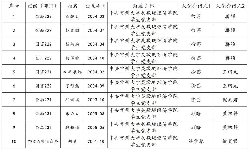 根据我校发展党员公示制度的有关规定,经党支部研究,并报请上级党委(工委)审查批准,拟提交支部大会讨论接收10名同志为中共预备党员,现予以公示,公示期7天,若有不同意见请于2025年6月9日前以口头或书面形式向咪咕体育直播 学工办反映。联系电话:0519-88519207,地址:立言楼413。
