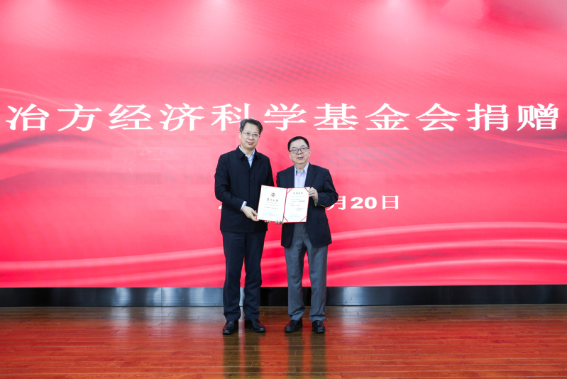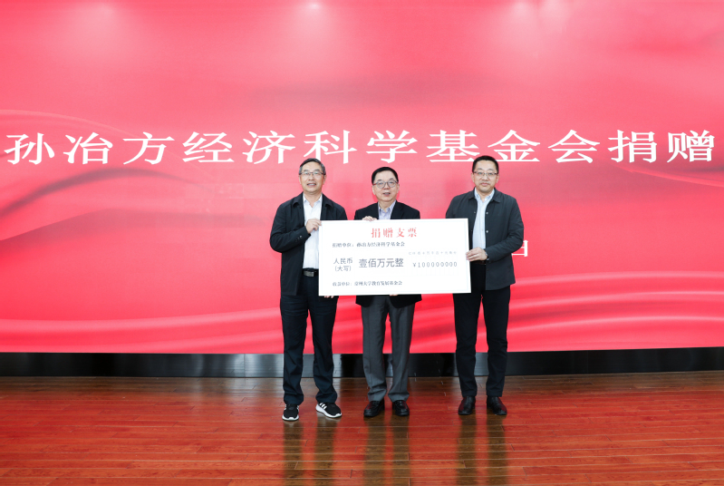 李剑阁理事长代表孙冶方经济科学基金会向常州大学教育发展基金会和咪咕体育直播 捐赠100万元成立“吴敬琏奖学金”,咪咕体育直播 院长姜国刚接受捐赠,徐守坤向李剑阁理事长颁发捐赠证书。