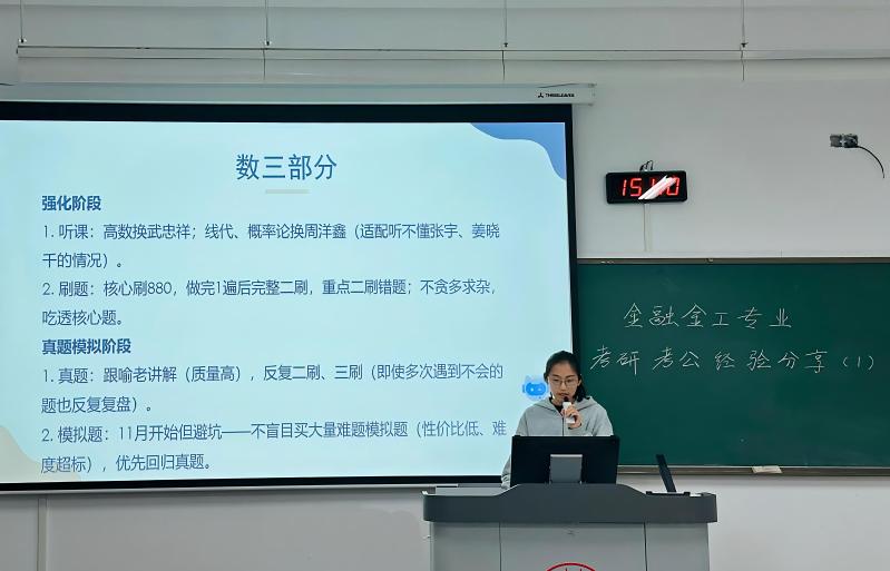 三位优秀学子结合自身实战经历,分别从目标规划、学习方法、心态调整等方面进行了精彩讲述。徐榕尉同学(南京理工大学应用经济学拟录取)系统分享了自己的成长历程与备考心得,她特别强调“日积月累”与“目标管理”的相互作用,认为清晰的阶段性目标能够为长期备考提供持续动力。刘兢贝同学(南京财经大学金融专硕拟录取)以“方法制胜,高效备考”为重点,结合各科目备考策略,分享了高效笔记、真题研究和心态调节的实用方法。李宇轩同学(国家税务总局通州区税务局拟录用),讲述了自己从学业低谷到国考、省考“双第一”的蜕变历程,他结合备考中的挫折与突破,强调了坚持与自我调适在长期备考中的重要作用。